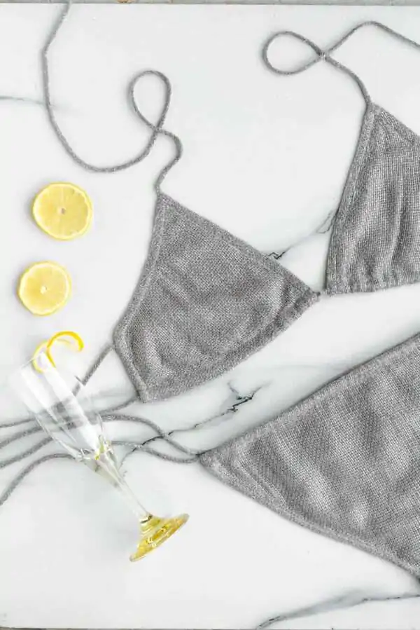 Viscose lurex matte lined with cotton net, adjustable cord and wooden bead stopper. The Bobo bikini set is the perfect statement wear complimenting the Silver Bird Coverup.