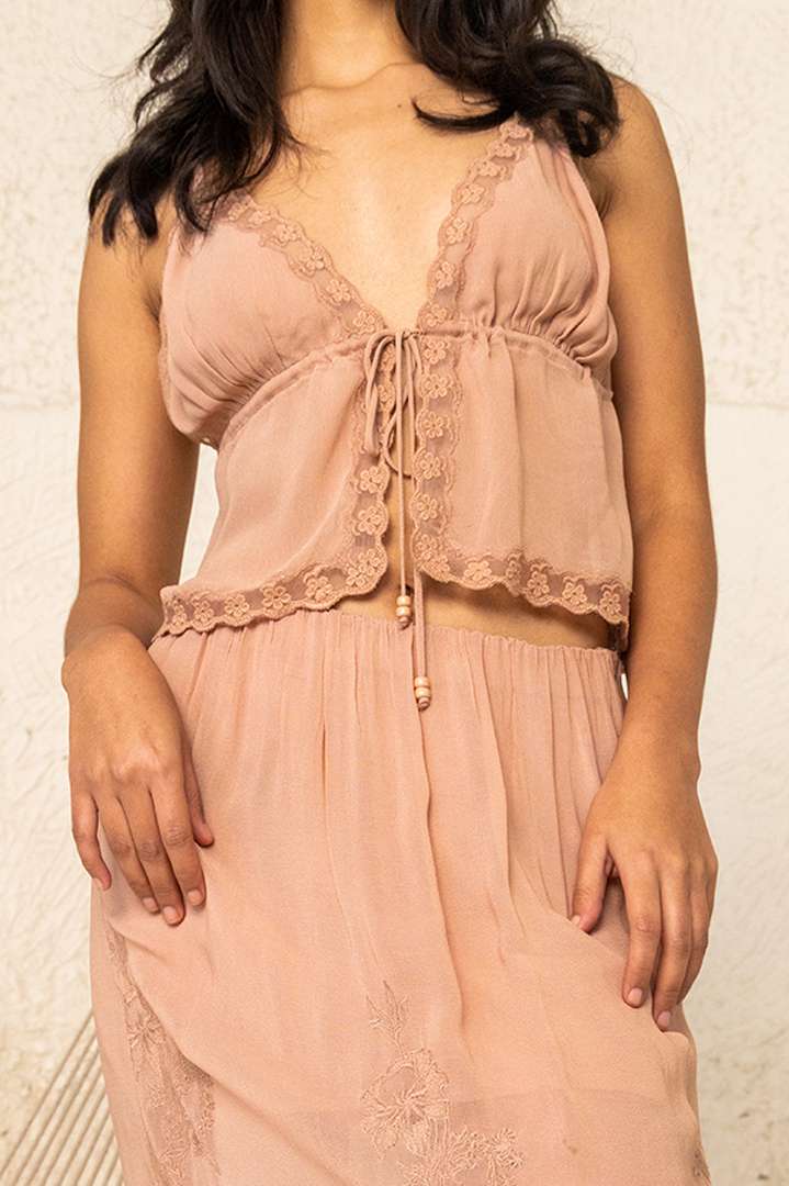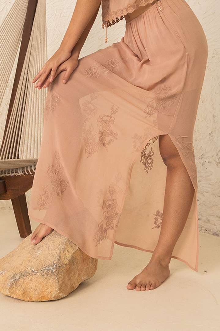 A noodle strap front open crop top which is adorned by an edging detail on the front and back and has an elasticated waist, a functional drawstring in the front and an edge finish with wooden beads. And A beige georgette straight skirt with all-around embroidery on the waist, a cotton voile lining and a slit on one side.